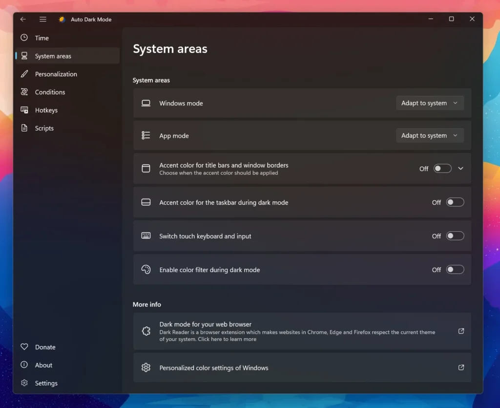 What I love is how customizable it is. It’s not just about switching themes. Auto Dark Mode can change wallpapers, accent colors, the mouse cursor, and even run scripts—all automatically. For gamers or anyone running full-screen apps, it respects your workflow and avoids switching mid-game.