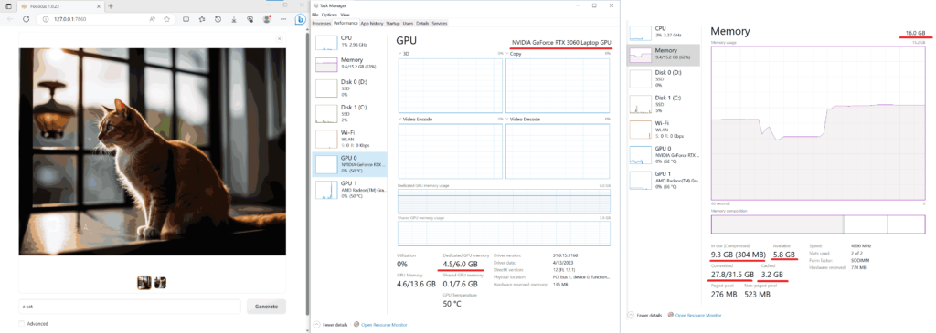 | Windows | AMD GPU | 8GB | 8GB | DirectML support, ~3x slower than Nvidia RTX 3XXX |