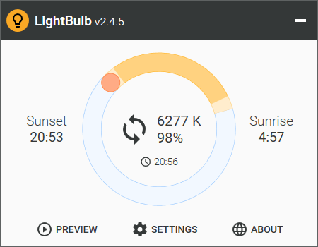 LightBulb is an innovative application designed to reduce eyestrain caused by prolonged exposure to computer screens, especially during late-night work sessions. By continuously adjusting gamma levels, LightBulb transitions the display color temperature from cool blue tones during the day to warm yellow hues at night. Its primary goal is to harmonize your screen’s color with your surrounding light sources, bright sunlight during the day and artificial lighting at night.