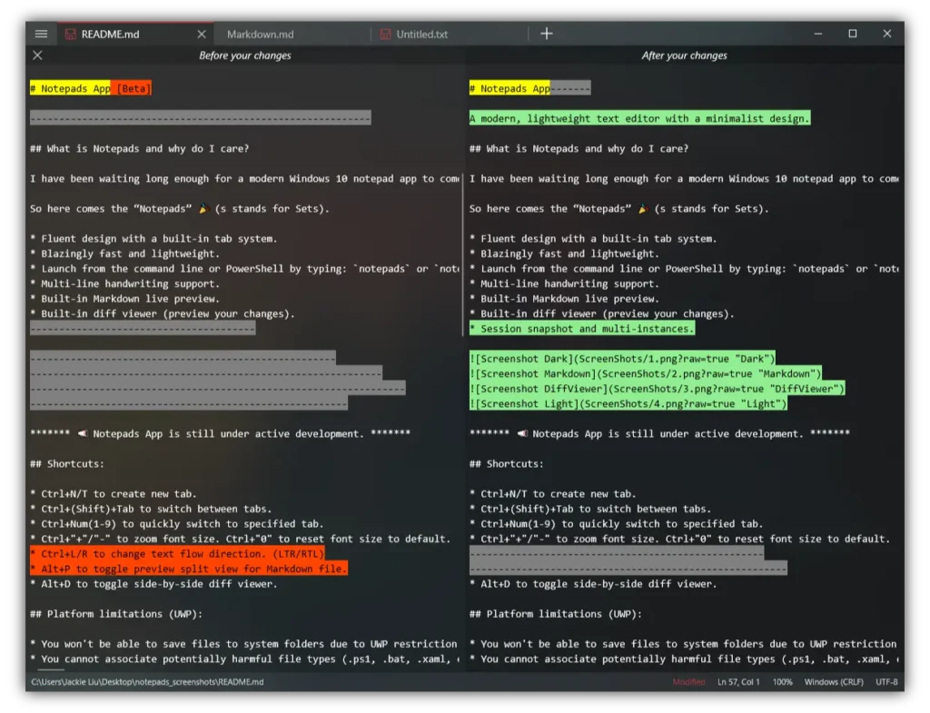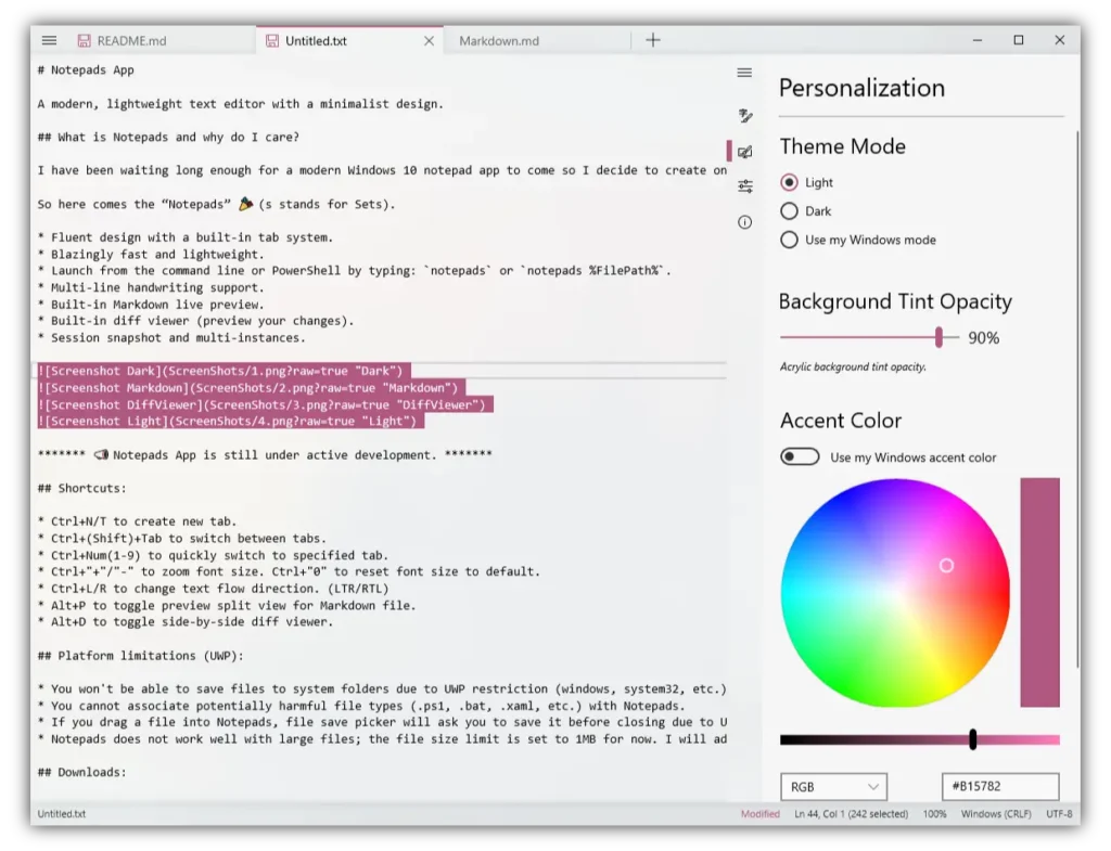 Notepads breaks free from the limitations of standard notepad applications, offering a lightning-fast, beautifully designed solution for everyone from casual note-takers to professional developers. Whether you’re quickly jotting down ideas, editing configuration files, or working on complex markdown documents, Notepads delivers a smooth, intuitive experience.