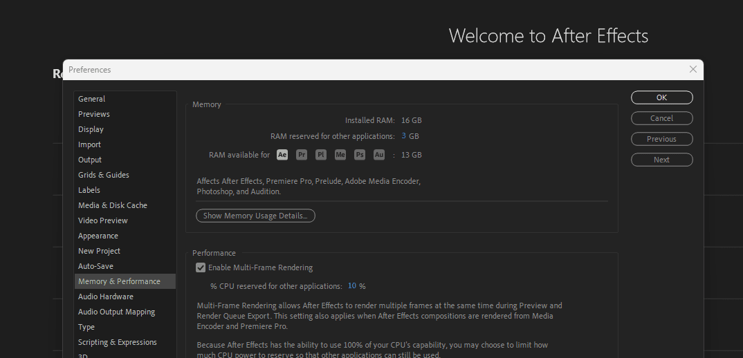 Virtual Memory works as a saviour when it comes to excessive memory usage and you can utilize this to boost After Effects Performance. Virtual Memory acts as a backup RAM which use your hard disk. Increasing its size can help when the physical RAM is maxed out.